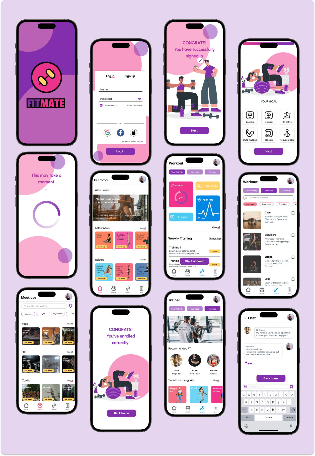 The chosen color palette centered around primary hues of purple and pink, contributing to a buoyant and invigorating atmosphere while incorporating various shades of blue as secondary colors to introduce a calming influence. Additionally, yellow and magenta are accent colors that infuse vibrant pops of visual interest and vivacity.