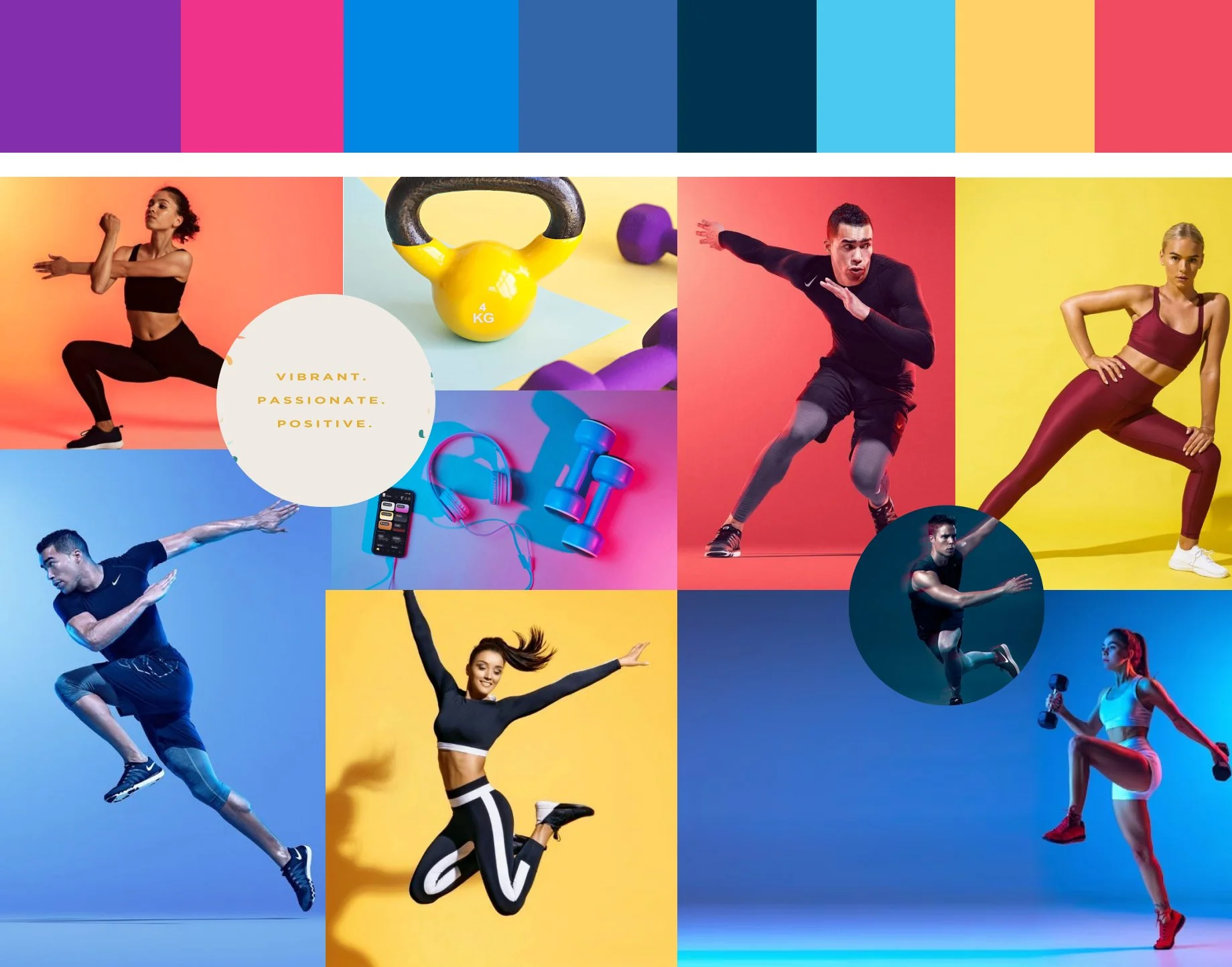 Utilizing the insights obtained from our competitive visual analysis, we decided to craft a mood board that would guide our design direction. Our intentional selection revolved around employing vivid and striking colors, aiming to foster an atmosphere of enjoyment, optimism, and vitality while conveying a sense of movement and energy.